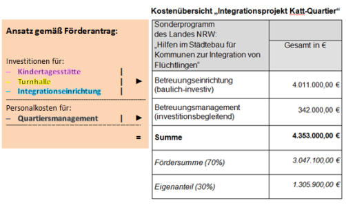 (Nähere Ausführungen zu den beabsichtigten Maßnahmen sind dem anliegenden Förderantrag unter „8. Anlage“, „II. Kurzbeschreibung der vorgesehenen Maßnahmen“ und „III. Projektskizze Integrationsprojekt Katt-Quartier“ zu entnehmen.)