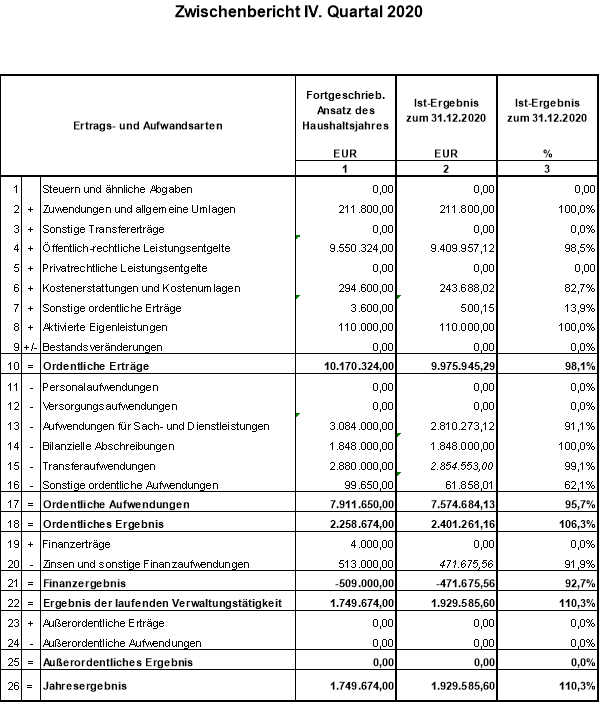 Grundsätzlich ist bisher für das Wirtschaftsjahr 2020 festzustellen, dass sich im Ergebnisplan ein planmäßiger Vollzug ergibt. Die endgültige Entwicklung kann allerdings erst im Rahmen der Aufstellung des Jahresabschlusses 2020 dargestellt werden. Erst dann kann definitiv festgestellt werden, welcher Jahresgewinn sich für 2020 ergibt, da wesentliche Aufwendungen (Abschreibungen, Personal-/Verwaltungs-/Sachkostenerstattung an die Stadt) und Erträge (u. a. Kostenerstattungen, Auflösung der Beiträge und Zuschüsse, aktivierte Eigenleistungen) erst im Rahmen der Jahresabschlussarbeiten bzw. bei der Erstellung der Schlussbilanz ermittelt werden.
