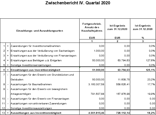 Auszahlungen für den Erwerb von beweglichem Anlagevermögen Diese Position ist zum 31.12.2020 lediglich zu 19,9 % oder rund 158.000 € ausgeschöpft.