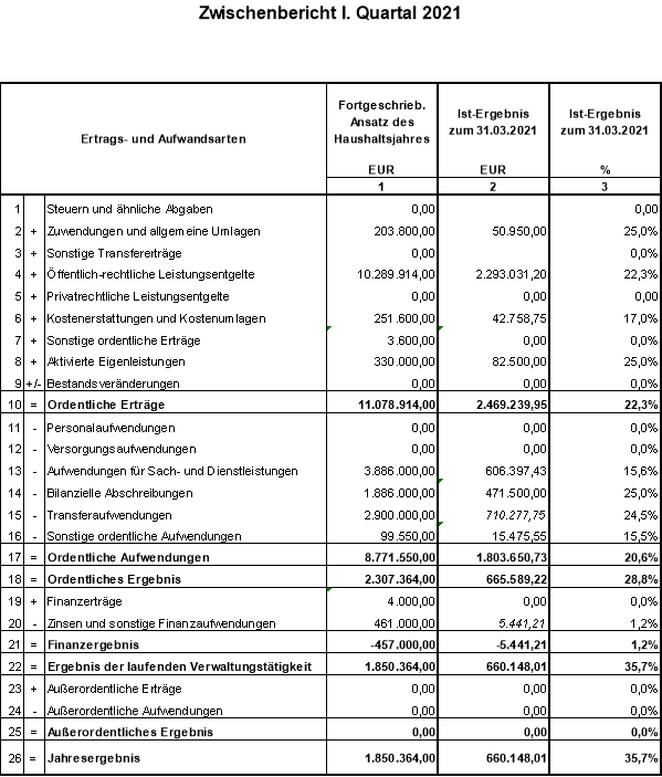 Grundsätzlich ist bisher für das Wirtschaftsjahr 2021 festzustellen, dass sich im Ergebnisplan ein planmäßiger Vollzug ergibt. Die endgültige Entwicklung kann allerdings erst im Rahmen der Aufstellung des Jahresabschlusses 2021 dargestellt werden. Erst dann kann definitiv festgestellt werden, welcher Jahresgewinn sich für 2021 ergibt, da wesentliche Aufwendungen (Abschreibungen, Personal-/Verwaltungs-/Sachkostenerstattung an die Stadt) und Erträge (u. a. Kostenerstattungen, Auflösung der Beiträge und Zuschüsse, aktivierte Eigenleistungen) erst im Rahmen der Jahresabschlussarbeiten bzw. bei der Erstellung der Schlussbilanz ermittelt werden.
