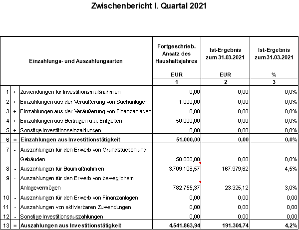 Auszahlungen für Baumaßnahmen Diese Position ist zum 31.03.2021 nur zu 4,5% oder rund 168.000 € ausgeschöpft.