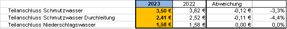 Der Gebührenbedarf beim Teilanschluss Schmutzwasser sinkt gegenüber dem Vorjahr um 7.671 € (- 0,1 %) auf 5.807.991 € (2022: 5.815.662 €). Es konnte eine Überdeckung aus Vorjahren in Höhe von 100.435 € in Abzug gebracht werden (2022: 20.000 €). Die Schmutzwassergebühr sinkt gegenüber dem Vorjahr auf 3,50 € pro m³ (- 0,12 € /- 3,3 %).