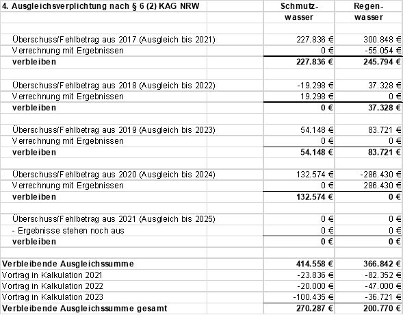 Nach der Regelung des KAG NRW sind Kostenüberdeckungen innerhalb von 4 Jahren auszugleichen. Kostenunterdeckungen sollen in diesem Zeitraum ausgeglichen werden.