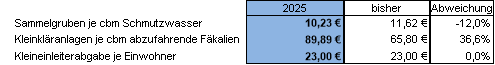 Der Gebührensatz für die Kleinkläranlagen steigt im Vergleich zum Vorjahr auf 89,89 € (2024: 65,80 €) pro m³. Der Gebührenbedarf 2025 steigt gegenüber dem Vorjahr um 3.436 € (23,6 %) auf 17.978 € (2024: 14.542 €). Hierbei wurde eine Unterdeckung aus dem Jahr 2021 in Höhe von 4.248 € berücksichtigt. Bei den Kleinkläranlagen wird in der Kalkulation 2025 eine Schlammmenge von 200 m³ berücksichtigt (2024: 221 m³).