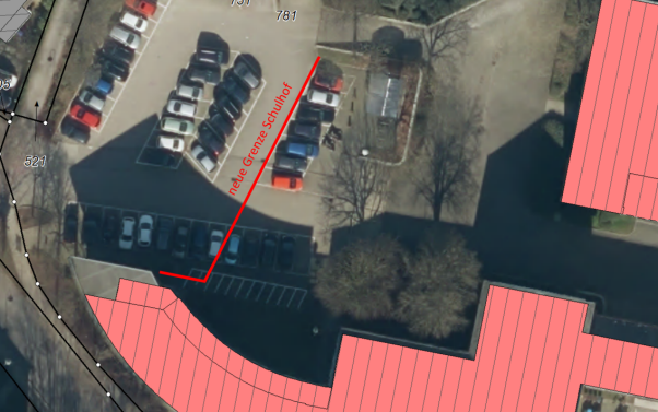 Für eine weitere deutliche flächenmäßige Vergrößerung der Schulhoffläche bietet sich der Lehrerparkplatz an der Stockhauser Straße an. Da hier aber auch auf die Belange der auswärtigen Lehrerinnen und Lehrer Rücksicht zu nehmen ist, wird vorgeschlagen, nur einen Teil des Parkplatzes dem Schulhof zuzuschlagen und einen Teil der Lehrerparkplätze zu erhalten. Aktuell sind auf der Fläche etwa 35 PKW-Stellplätze vorhanden. Auf der untenstehenden Skizze ist eine mögliche Teilung des Parkplatzes dargestellt, wobei dann ca. 17 Stellplätze verloren gehen würden.